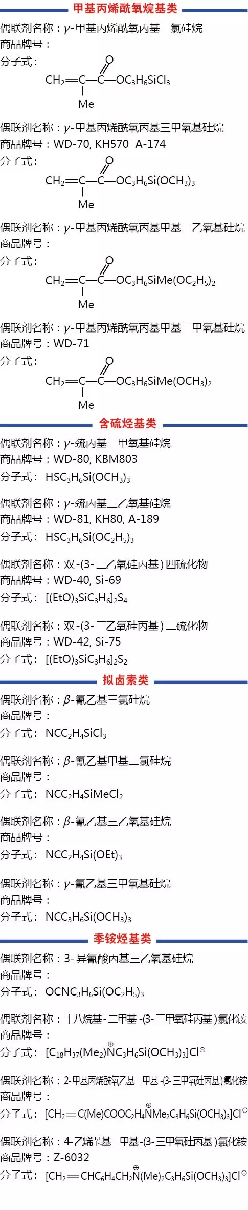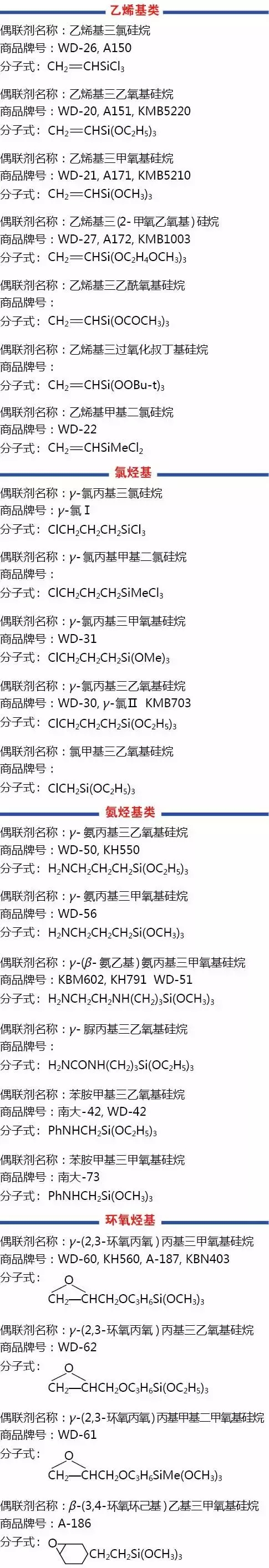 硅烷偶联剂的命名准则通常以硅烷(silane)作为主体名,连缀上替代基或许硅官能团的称号,并按规矩次序注出替代基或许碳官能团的方位,然后得到硅烷偶联剂的化学分子式称号。在日常的生产经营进程中,硅烷偶联剂常以商品名见于多种场合。由于前史原因,硅烷职业仍有选用不一样的商标系统命名产品。其间国产硅烷偶联剂包含:以KH最初的中科院商标系统,以WD最初的湖北武大有机硅公司商标系统,以JH最初的湖北荆州江汉精细化工有限公司商标系统等。此外,道康宁、迈图、信越、赢创德固赛等均有各自商标系统,国内市场也有所使用。