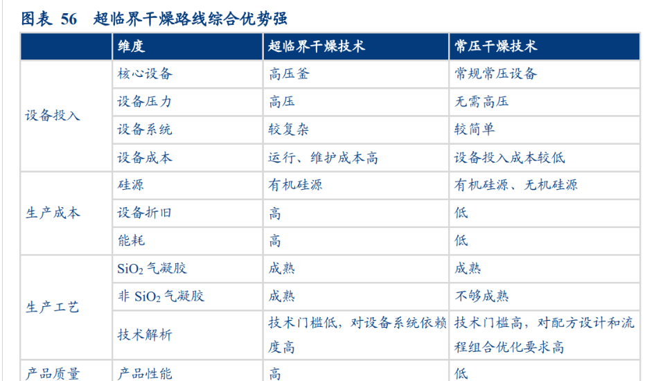 常压干燥前常常要对湿凝胶进行长时间的透析和溶剂置换处理,且know-how能力要求高,国内虽有同济大学在实验室成功突破,但产业化成功案例较少。因此当前大多数产能为超临界干燥路线。
