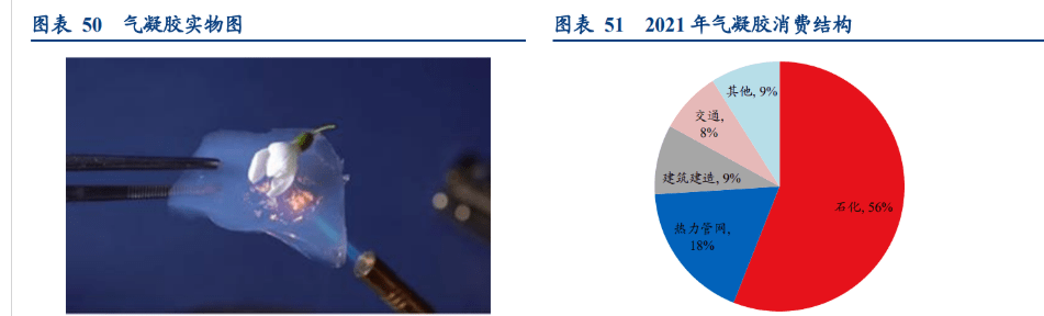 气凝胶是一种具有纳米多孔网络结构、并在孔隙中充满气态分散介质的固体材料,也是世界上最轻的固体。由于独特的结构,气凝胶在热学、声学、光学、电学、力学等多个领域都展示出优异的性能。目前商业化应用的气凝胶主要围绕其高效的隔热能力展开,下游用于石油化学工业、热力管网、锂电池、建筑建材、户外服饰、航天、军工等多个领域。