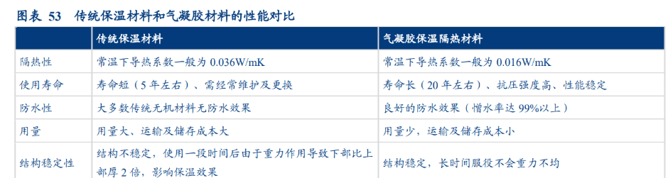 气凝胶具有防水性好、阻燃性好、不易被腐蚀、结构稳定性高的特点,其更换周期在20年左右,而传统保温材料的更换周期在5年左右。