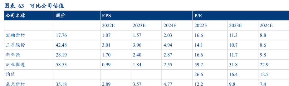 由于公司主业为功能性硅烷,第二增长曲线为气凝胶业务。因此我们选取功能性硅烷龙头三孚股份、宏柏新材、新亚强以及气凝胶企业泛亚微透为可比公司做估值。根据wind一致预期的结果,可比公司2022-2024年P/E均值为27.6、17.0、13.0x。